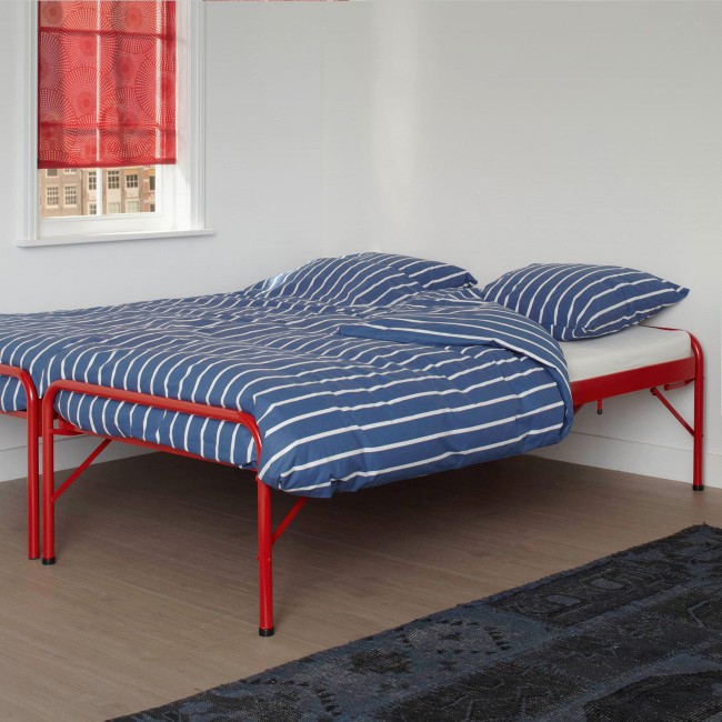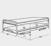 Neemt de ruimte in van een 1-persoonsbed en is makkelijk om te zetten naar een 2-persoonsbed. Het onderbed is makkelijk in/uit te klappen en word met behulp van wieltjes onder het bovenbed gereden. Tussen het onder- en het boven-bed is 22 cm ruimte voor de matras. De lighoogte (zonder matras) is 40 cm.